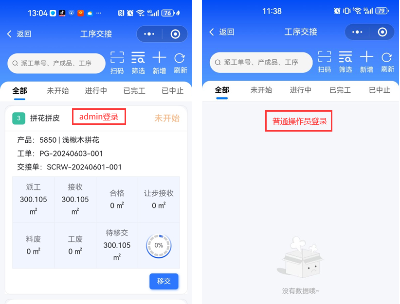 ![]() 3、問題描述:用admin登錄小程序后,點(diǎn)擊【工序交接】進(jìn)入能查詢到派工單,但是普通操作員登錄后查詢不到派工單。