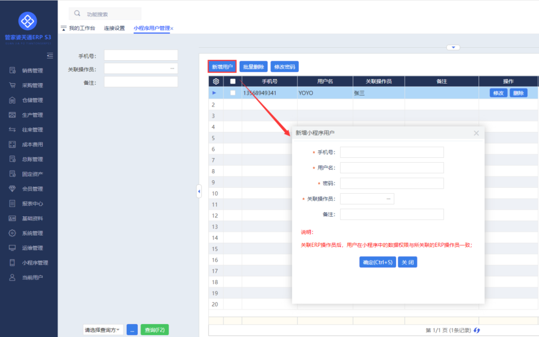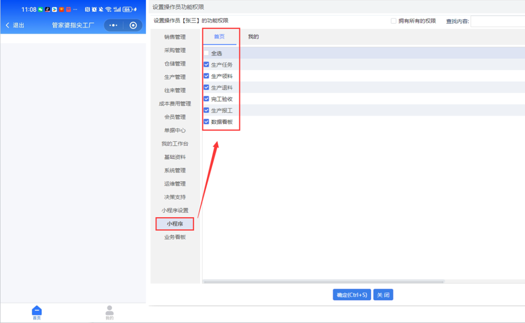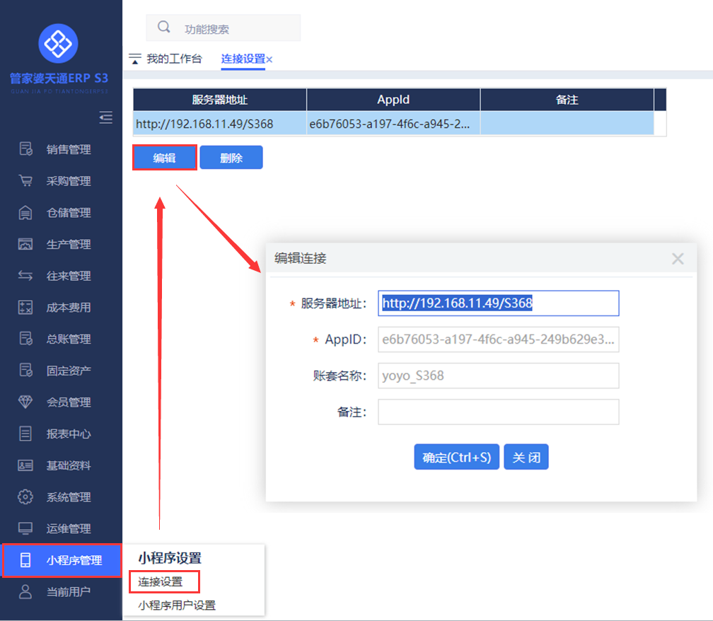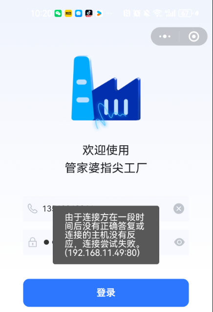 S系列6.8版本支持對(duì)接指尖工廠小程序,配置方法以及常見問題的解決方法,請(qǐng)看下面的具體操作。 1、系統(tǒng)管理—單據(jù)配置—按Ctrl+Q顯示“其他”配置,勾選【啟用小程序】。 ![]() 2、重新進(jìn)入軟件后,導(dǎo)航界面會(huì)顯示【小程序管理】模塊,先點(diǎn)擊【連接設(shè)置】進(jìn)入,設(shè)置對(duì)應(yīng)小程序的地址和賬套。 ![]() 3、再點(diǎn)擊導(dǎo)航界面的【小程序管理】進(jìn)入【小程序用戶設(shè)置】,設(shè)置小程序登錄的用戶名、手機(jī)號(hào)及關(guān)聯(lián)操作員。 ![]() 4、最后點(diǎn)擊軟件右上角,微信小程序二維碼,用微信掃描進(jìn)入對(duì)應(yīng)小程序,輸入手機(jī)號(hào)和密碼登錄即可。 ![]() ![]() 1、問題描述:微信小程序登錄時(shí)提示:由于連接方在一段時(shí)間后沒有正確答復(fù)或連接的主機(jī)沒有反應(yīng),連接嘗試失敗。(192.168.11.49:80)