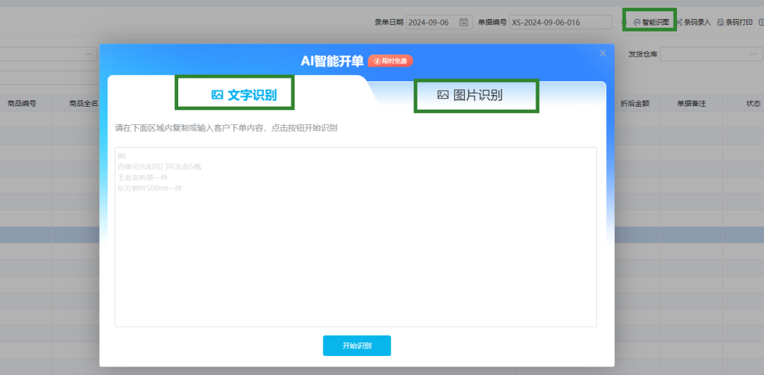 為減輕客戶的錄入工作量、提高工作效率,云輝煌系列增加了業(yè)務(wù)單據(jù) “智能識(shí)圖”開單功能,便于客戶可以快速識(shí)別圖片進(jìn)行開單。 云輝煌、云輝煌ERP16.2/16.25/ 16.3支持的,其他的版本例如輝煌二、云輝煌二、輝煌ERP Silverlight系列不支持。 1、支持單據(jù)類型 進(jìn)貨類:請(qǐng)購(gòu)單、詢價(jià)單、進(jìn)貨訂單、進(jìn)貨單、進(jìn)貨退貨單 銷售類:報(bào)價(jià)單、銷售訂單、銷售單、銷售退貨單 2、具體實(shí)現(xiàn) 單據(jù)表頭增加按鈕“智能識(shí)圖”,點(diǎn)擊進(jìn)入可選圖片或者文字進(jìn)行識(shí)別商品信息,識(shí)別后自動(dòng)帶入到單據(jù)表體中。 A、文字識(shí)別 在白色的區(qū)域里面輸入下客戶的下單信息,商品信息包括商品名稱計(jì)量單位需要和軟件里面的一致。
