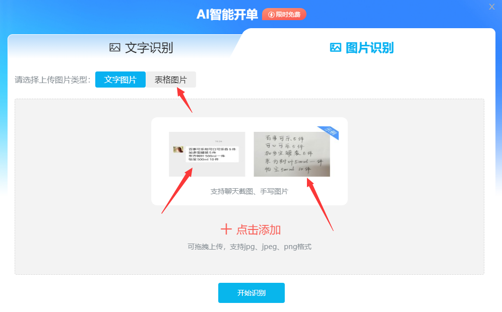 B、圖片識(shí)別 支持的類型:文字圖片、表格圖片 圖片格式:支持jpg、jpeg、png格式