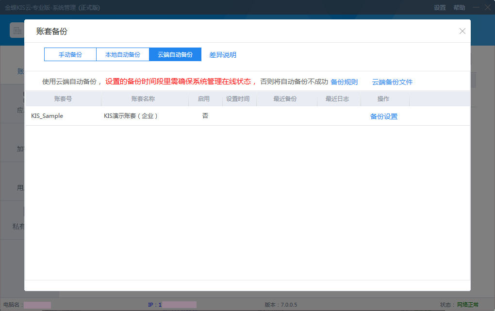 云端自動(dòng)備份文件刪除后不可恢復(fù)。 云端自動(dòng)備份文件下載控制每個(gè)產(chǎn)品實(shí)例下所有賬套每天下載不超過(guò)100次,超過(guò)將當(dāng)天不允許再進(jìn)行下載。 4、云端自動(dòng)備份使用詳細(xì)控制規(guī)則 ① 根據(jù)購(gòu)買的云備份賬套數(shù)和每天云端存儲(chǔ)的賬套備份文件數(shù)同時(shí)進(jìn)行控制。 ② 云端每天新增自動(dòng)云備份存儲(chǔ)的賬套備份文件數(shù)也不允許超過(guò)購(gòu)買的賬套數(shù)。 ③ 購(gòu)買的KIS云私有部署賬套云備份服務(wù)到期后,系統(tǒng)將自動(dòng)關(guān)閉云端自動(dòng)備份,原已上傳至云端的數(shù)據(jù),仍然允許進(jìn)行下載。 ④ 每個(gè)賬套每天云備份一次,云端最多保留每個(gè)賬套最近成功云備份的7個(gè)賬套備份文件。 ⑤ 使用云端自動(dòng)備份,在設(shè)置的賬套備份時(shí)間內(nèi),需確保系統(tǒng)管理為在線狀態(tài)。 ⑥ 云端自動(dòng)備份失敗時(shí),會(huì)以手機(jī)短信的方式發(fā)送失敗原因到登錄系統(tǒng)的手機(jī)號(hào)碼,并告知失敗的可能原因,供用戶進(jìn)行排查。 ⑦ 當(dāng)天云端賬套數(shù)=購(gòu)買的總賬數(shù)時(shí),修改云端自動(dòng)備份設(shè)置方案,修改后的云端自動(dòng)備份方案將從下一天開(kāi)始執(zhí)行。 ⑧ 云端自動(dòng)備份會(huì)先將賬套備份文件保存在本地,云端存儲(chǔ)成功后,本地備份文件將自動(dòng)刪除。