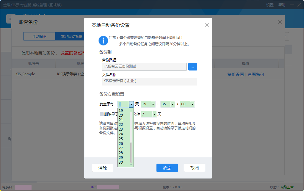 備份設(shè)置方案與原有的本地備份相比,調(diào)整了備份設(shè)置中的發(fā)生于每*天,控制在了1-30天,對(duì)應(yīng)的刪除早于此時(shí)間的文件*天,也調(diào)整為1-30天。其他的設(shè)置內(nèi)容均與原有的保持一致。