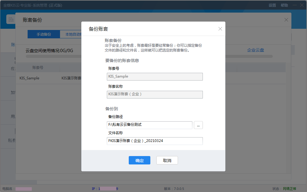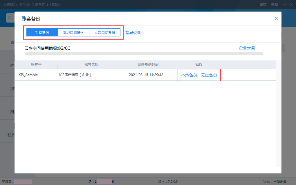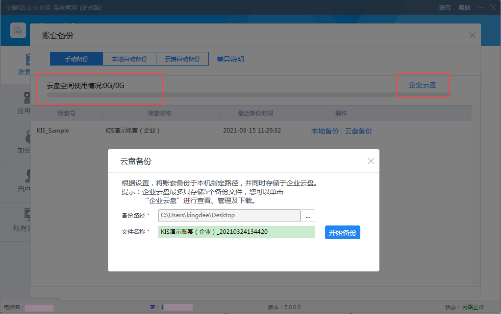 2、云盤備份 云盤備份即對(duì)應(yīng)原有的云盤備份功能。且會(huì)在手工備份的界面顯示云盤空間使用情況,以及查看企業(yè)云盤的中的賬套備份信息。
