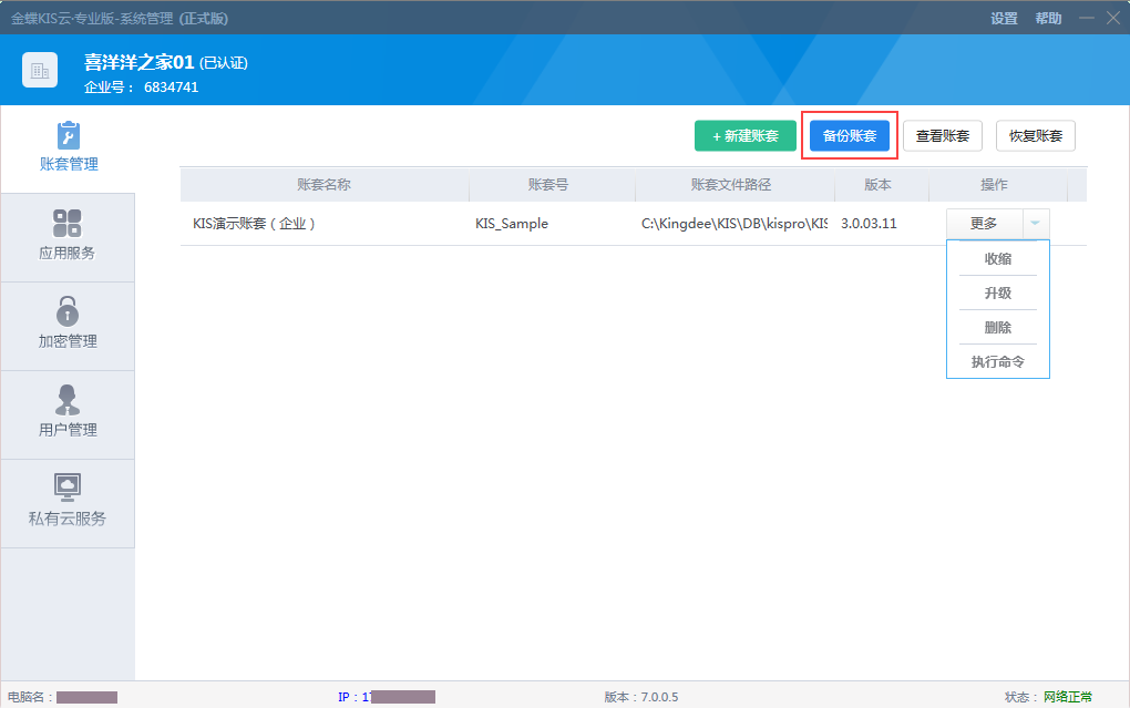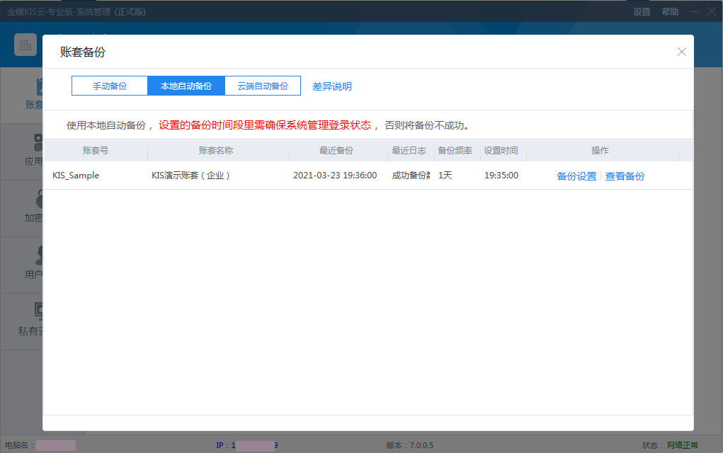 本文概述了金蝶KIS云系列產(chǎn)品新推出的賬套云備份服務(wù)功能。該功能旨在解決企業(yè)面臨的數(shù)據(jù)安全風(fēng)險(xiǎn),如勒索病毒攻擊、硬盤物理?yè)p傷和誤操作導(dǎo)致的數(shù)據(jù)丟失。金蝶KIS云私有部署賬套云備份服務(wù)允許用戶將賬套備份在本地或云端,確保數(shù)據(jù)安全,并能在數(shù)據(jù)丟失時(shí)快速恢復(fù),減少損失。該服務(wù)適用于多種場(chǎng)景,包括網(wǎng)絡(luò)在線、病毒入侵、軟硬件故障等,并提供了手動(dòng)備份、本地自動(dòng)備份和云端自動(dòng)備份三種方式。云端自動(dòng)備份功能特別針對(duì)KIS云主產(chǎn)品提供訂閱服務(wù),有詳細(xì)的試用和使用控制規(guī)則,以及備份文件管理和失敗通知機(jī)制。 一、服務(wù)簡(jiǎn)介 近年勒索病毒肆虐全球,企業(yè)電腦一旦被感染,磁盤文件會(huì)被病毒加密,被攻擊者通常只能選擇支付高額贖金,否則無(wú)法恢復(fù)數(shù)據(jù);另外企業(yè)自用服務(wù)器在使用過(guò)程中存在硬盤物理?yè)p傷風(fēng)險(xiǎn);用戶誤操作也可能導(dǎo)致數(shù)據(jù)丟失。 為幫助企業(yè)客戶規(guī)避上述各種風(fēng)險(xiǎn),保障私有部署方式用戶的賬套安全,金蝶KIS云系列產(chǎn)品在原有本地備份的功能上,全新推出賬套云備份服務(wù)功能,現(xiàn)在KIS云用戶不僅可以將企業(yè)賬套備份在本地電腦指定路徑,也可以選擇將賬套備份自動(dòng)上傳云端,充分保障賬套數(shù)據(jù)安全,如果企業(yè)因各種原因?qū)е沦~套數(shù)據(jù)丟失,今后可在云端快速恢復(fù)賬套,減少資金和時(shí)間損失。 二、適用場(chǎng)景 金蝶KIS云私有部署賬套云備份服務(wù)適用于以下場(chǎng)景: l 服務(wù)器操作系統(tǒng)需要連續(xù)24小時(shí)以上網(wǎng)絡(luò)在線 l 賬套數(shù)據(jù)被病毒入侵需要比特幣恢復(fù) l 軟硬件故障導(dǎo)致本地?cái)?shù)據(jù)損壞 l 接受賬套數(shù)據(jù)云端歸檔保存 溫馨提示:特別是受過(guò)上述2-3所述傷害的客戶建議選購(gòu)此服務(wù)。 金蝶KIS云私有部署賬套云備份服務(wù)在確保系統(tǒng)管理和網(wǎng)絡(luò)在線的情況下,每天自動(dòng)對(duì)指定賬套進(jìn)行云端備份,確保賬套備份數(shù)據(jù)無(wú)憂。如在設(shè)置備份方案后云端備份不成功,將以短信的方式通知登錄系統(tǒng)管理的管理員用戶賬套云端備份不成功以及可能的原因,管理員可及時(shí)進(jìn)行檢查。 三、使用說(shuō)明 (一)賬套備份功能整合 1、系統(tǒng)管理-賬套管理界面,原每個(gè)賬套對(duì)應(yīng)的操作列,更多中取消【手動(dòng)備份】【自動(dòng)備份】和【云盤備份】三個(gè)菜單的顯示(其中旗艦版僅有【備份賬套】功能。) 2、在系統(tǒng)管理-賬套管理界面上方增加統(tǒng)一的按鈕【備份賬套】。如下圖所示。