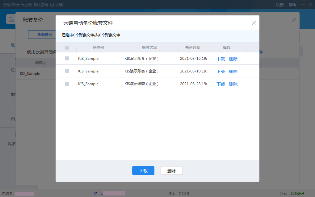 可以選擇需要下載或刪除的賬套: