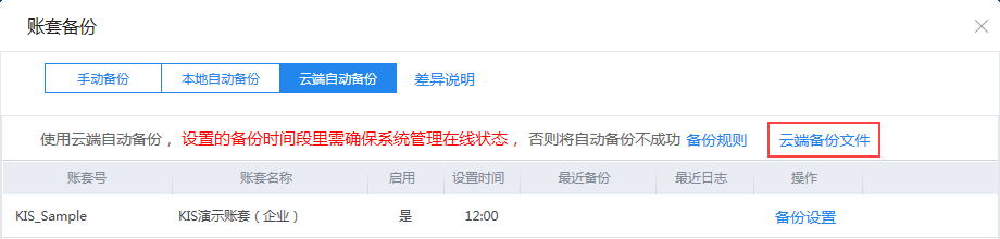 在備份設(shè)置界面設(shè)置備份至本地的路徑,文件夾名稱不允許修改。 備份方案設(shè)置默認(rèn)時(shí)間為中午12點(diǎn),允許用戶進(jìn)行修改,與本地自動(dòng)備份相比,不提供天數(shù)的選擇,即表示按照每天的設(shè)置時(shí)間進(jìn)行云端自動(dòng)備份。 【啟用】選項(xiàng):?jiǎn)⒂贸晒?,云端自?dòng)備份設(shè)置才會(huì)生效,如未啟用則不會(huì)執(zhí)行云端自動(dòng)備份。 關(guān)于備份方案時(shí)點(diǎn)選擇的溫馨提示: 由于每家企業(yè)的實(shí)際工作環(huán)境、賬套大小等不一樣,這個(gè)時(shí)間點(diǎn)的選擇請(qǐng)綜合多方面的考慮進(jìn)行設(shè)置: 1) 客戶業(yè)務(wù)的繁忙程度 ,如果有高頻的數(shù)據(jù)不斷產(chǎn)生,備份時(shí)點(diǎn)需要選擇符合客戶實(shí)際情況的時(shí)點(diǎn),建議錯(cuò)峰選擇。 2) 考慮到備份數(shù)據(jù)時(shí)對(duì)數(shù)據(jù)庫(kù)性能的影響,特別是對(duì)于某些超大的賬套(比如電商客戶40G的賬套),建議日常對(duì)賬套進(jìn)行優(yōu)化。 3) 數(shù)據(jù)上傳依賴于本地網(wǎng)絡(luò),需要考慮自動(dòng)備份對(duì)帶寬的占用,避免超大文件上傳影響效率。 系統(tǒng)支持清除云端自動(dòng)備份方案,設(shè)置完成后也支持用戶修改方案。修改時(shí)系統(tǒng)會(huì)判斷修改后的時(shí)間當(dāng)前是否還可以進(jìn)行云端自動(dòng)備份,如不可以會(huì)提示用戶備份方案將從下一天開(kāi)始生效。 云端備份文件 已經(jīng)上傳至云端的備份文件通過(guò)【云端備份文件】功能查閱,可以對(duì)已儲(chǔ)存的備份進(jìn)行下載和刪除。