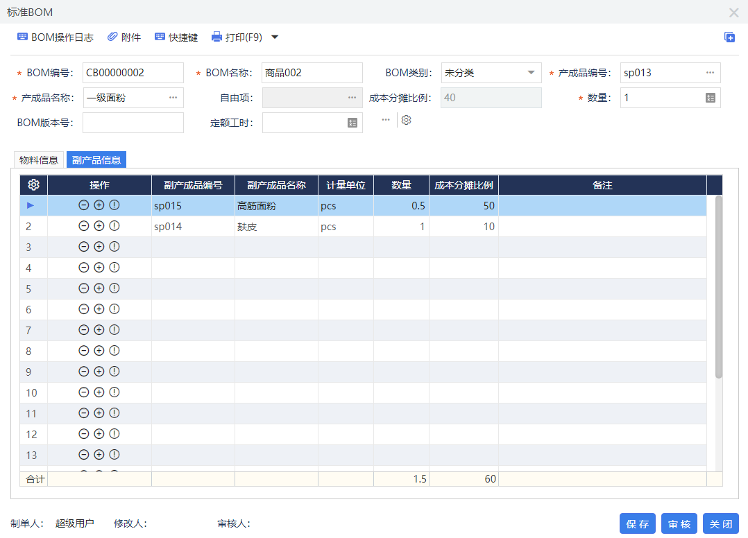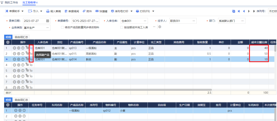 ![]() 生產管理配置啟用副產成品管理。 ![]() 標準BOM/訂單BOM維護產成品關聯(lián)副產品信息,包含副產成品數(shù)量、成本分攤比例等數(shù)據(jù)。 其中: ①生產出多種產成品,取一種為主產品,其余產出產成品均可作為副產品與主產品進行關聯(lián)。 ②副產成品數(shù)量為產出表頭主產成品數(shù)量時,可同步產出其他副產成品的數(shù)量。 ③成本分攤比例為各產成品分攤物料成本金額的占比。 ![]() 完工驗收單引入上游單據(jù)或手動做單選擇產成品,單據(jù)會自動帶出BOM中已關聯(lián)副產成品信息,還可以在驗收單選中主產成品添加關聯(lián)副產成品。 ①驗收單支持調整成本分攤比例。 ②表頭選擇按定額成本完成入庫時,成本分攤比例無效。 ③委外完工驗收單同樣支持副產成品管理功能。