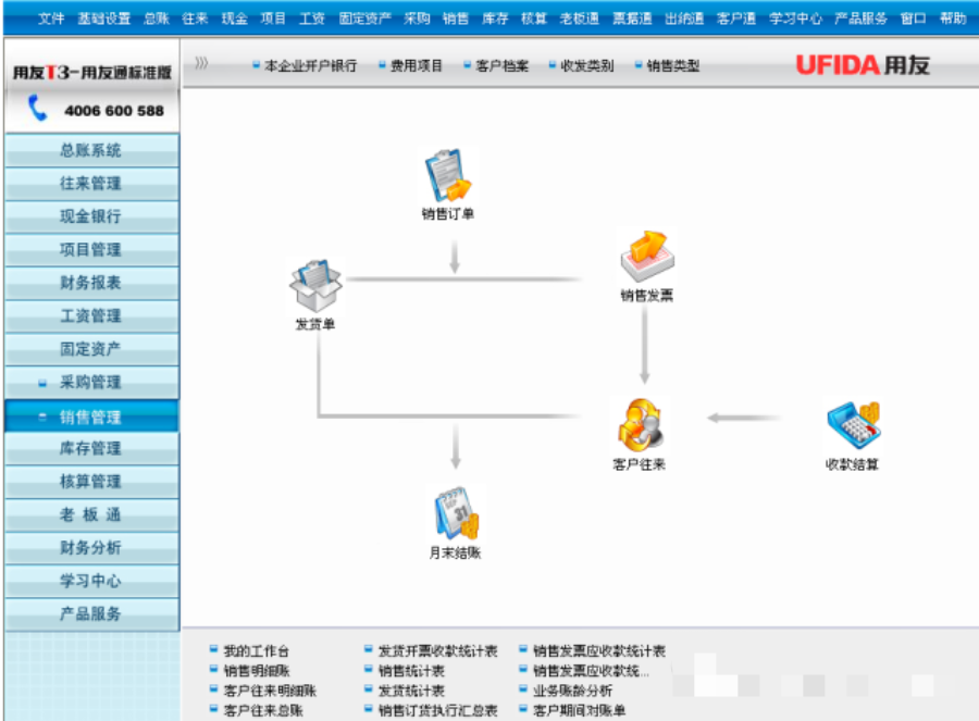 1采購訂單:點擊增加->錄入相關(guān)信息->保存->審核 (注:采購訂單只有審核才能在庫存模塊流轉(zhuǎn)生成采購入庫單) 2采購入庫單: A.庫存模塊點擊采購入庫單增加->“生單”->“采購訂單”->錄入時間或其他條件->“過濾”->選擇并確認(rèn)->保存 B.在庫存模塊,點擊“采購入庫單審核”,錄入時間或其他條件à“過濾” à點擊確認(rèn),審核 注:采購入庫單只能采購模塊中填制保存并在庫存模塊中審核,另外單據(jù)審核后確定為現(xiàn)存量,否則只是體現(xiàn)在待發(fā)數(shù)量上,不過都會影響可用量。 3采購發(fā)票:采購模塊點擊發(fā)票,選擇發(fā)票類型(專用、普通)增加->表體處右鍵選擇拷貝(入庫單或訂單)->錄入過濾條件,發(fā)票號->選擇確定->保存 現(xiàn)付:可以直接點擊現(xiàn)付按鈕,輸入金額執(zhí)行現(xiàn)付,單據(jù)標(biāo)志現(xiàn)付。但是發(fā)票還需要進(jìn)行復(fù)核。 4采購結(jié)算:對于采購入庫單而言,如果和采購發(fā)票之間執(zhí)行結(jié)算,邏輯上進(jìn)行勾兌,該筆業(yè)務(wù)才不算暫估,反過來說,只要沒有作過結(jié)算的采購入庫單都屬于暫估。 自動結(jié)算:嚴(yán)格按照訂單->入庫單->發(fā)票過程進(jìn)行流轉(zhuǎn)的系列單據(jù)可以系統(tǒng)自動執(zhí)行結(jié)算 手工結(jié)算:采購模塊->采購結(jié)算->手工結(jié)算->過濾->入庫(選擇要結(jié)算的入庫單)->發(fā)票(選擇要結(jié)算的發(fā)票)->找到對應(yīng)關(guān)系->結(jié)算 費(fèi)用折扣結(jié)算:主要是針對運(yùn)費(fèi)發(fā)票分?jǐn)偟讲少彸杀镜那闆r,過程等同于手工結(jié)算,不過可以按照數(shù)量和金額進(jìn)行分?jǐn)偂?/span> 5暫估的處理(前期未來發(fā)票的采購入庫單,后期來發(fā)票) 首先找到采購入庫單和發(fā)票進(jìn)行采購結(jié)算->核算模塊->業(yè)務(wù)核算->結(jié)算成本處理->過濾對單據(jù)后,選擇->暫估按紐 暫估屬于記帳的一種,反記帳同時也會取消暫估業(yè)務(wù)的處理。暫估處理后,根據(jù)建帳初始選擇的暫估方式,自動生成紅藍(lán)單據(jù),針對紅藍(lán)單據(jù),在財務(wù)核算->生成憑證處也要給予適當(dāng)?shù)奶幚?/span> 5制單: 成本確認(rèn)庫存模塊針對入庫單審核后,存貨核算模塊->業(yè)務(wù)核算處正常單據(jù)記帳->選擇采購入庫單進(jìn)行記帳->財務(wù)核算處生成憑證->選擇->采購入庫單(暫估)是沒做結(jié)算的入庫,否則選擇采購入庫單(報銷)->確定后選擇生成憑證->總帳 往來確認(rèn)存貨核算->憑證->供應(yīng)商往來制單->選擇相應(yīng)的單據(jù)制單->制單處理->選擇記錄->生成憑證傳到總帳(其中如果該供應(yīng)商執(zhí)行了付款的業(yè)務(wù),制單處理后->選擇核銷制單) 注意:要求采購入庫單一定要錄入完全對應(yīng)信息,比如收發(fā)類別直接決定能不能直接帶出科目 銷售管理