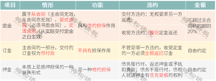 C公司在提供產(chǎn)品銷(xiāo)售的同時(shí)還提供職業(yè)技術(shù)培訓(xùn)服務(wù),年收入1000萬(wàn)元。公司在簽訂銷(xiāo)售合同時(shí),若約定技術(shù)培訓(xùn)服務(wù)免費(fèi),則收入全部按照13%繳納增值稅。 改變銷(xiāo)售合同,分別約定銷(xiāo)售產(chǎn)品的價(jià)格和培訓(xùn)服務(wù)的價(jià)格,假設(shè)職業(yè)技術(shù)培訓(xùn)服務(wù)年收入200萬(wàn)元,可以選擇簡(jiǎn)易計(jì)稅,適用稅率3%,則有200萬(wàn)的收入從13%降為3%,減少增值稅20萬(wàn)元。 注:職業(yè)技術(shù)的培訓(xùn)不需要教育部門(mén)或者勞動(dòng)部門(mén)的前置行政許可。 通過(guò)以上案例可以發(fā)現(xiàn),在簽訂合同時(shí),多思考多變通,就能達(dá)到節(jié)稅的目的。實(shí)務(wù)中有很多業(yè)務(wù)都可進(jìn)行籌劃,我們歸納了可進(jìn)行增值稅稅收籌劃的7種業(yè)務(wù)以供參考。 #03 合同簽訂注意這6個(gè)事項(xiàng) 否則,風(fēng)險(xiǎn)巨大! 其實(shí)大多數(shù)合同的簽訂都有一些共同事項(xiàng),一定要注意對(duì)這些事項(xiàng)的明確,否則后期會(huì)產(chǎn)生不必要的爭(zhēng)議,還可能會(huì)給企業(yè)造成損失。 01 關(guān)注定金、訂金和押金的區(qū)別。 定金指,當(dāng)事人雙方為了保證債務(wù)的履行,約定由當(dāng)事人方先行支付給對(duì)方一定數(shù)額的貨幣作為擔(dān)保,定金的數(shù)額由當(dāng)事人約定,但不得超過(guò)主合同標(biāo)的額的20%。 定金合同要采用書(shū)面形式,并在合同中約定交付定金的期限,定金合同從實(shí)際交付定金之日生效,債務(wù)人履行債務(wù)后,定金應(yīng)當(dāng)?shù)肿鲀r(jià)款或者收回。給付定金的一方不履行約定債務(wù)的,無(wú)權(quán)要求返還定金;收受定金的一方不履行約定的債務(wù)的,應(yīng)當(dāng)雙倍返還定金。 訂金只是一個(gè)習(xí)慣用語(yǔ),而非法律概念。一般情況下,交付訂金的視作交付預(yù)付款。交付和收受訂金的當(dāng)事人一方不履行合同債務(wù)時(shí),不發(fā)生喪失或者雙倍返還預(yù)付款的后果。 押金,是一方當(dāng)事人將一定費(fèi)用存放在對(duì)方處保證自己的行為不會(huì)對(duì)對(duì)方利益造成損害,如果造成損害的可以以此費(fèi)用據(jù)實(shí)支付或另行賠償。在雙方法律關(guān)系不存在且無(wú)其他糾紛后,則押金應(yīng)予以退還。在違約時(shí)將會(huì)被扣除。 三者區(qū)別的歸納如下: