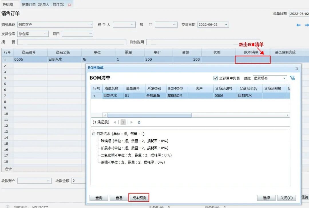 2、打開(kāi)銷售訂單——選中成品后——雙擊BOM清單列的單元格,即可彈出與之關(guān)聯(lián)的BOM清單。