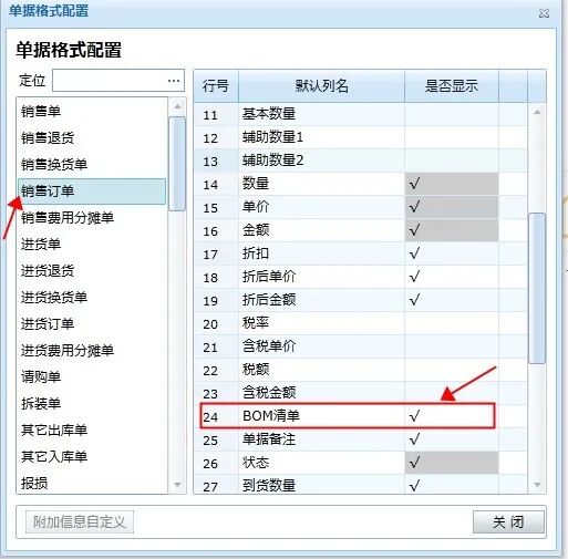 1、需要先在輔助功能——單據(jù)格式配置——銷售訂單——勾選上BOM清單,如下圖: