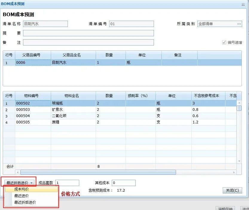 3、點(diǎn)擊【成本預(yù)測(cè)】按鈕,即可進(jìn)入到如下界面,【價(jià)格方式】按鈕選項(xiàng)為:成本均價(jià)、最近進(jìn)價(jià)、最近折后進(jìn)價(jià),切換后參考成本將按照選中的價(jià)格展示: